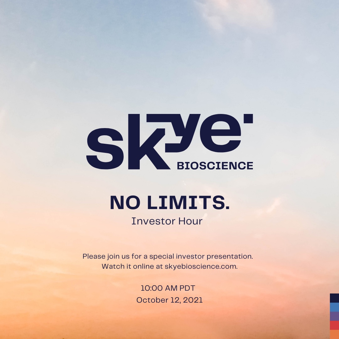 Questions may be submitted for consideration for this special event to ir@skyebioscience.com on or before September 28, 2021. All investors and analysts are requested to register in advance of the event. Registration is available via https://bit.ly/3lnmLO3 or via the Company’s Investor Relations website at https://ir.skyebioscience.com/.