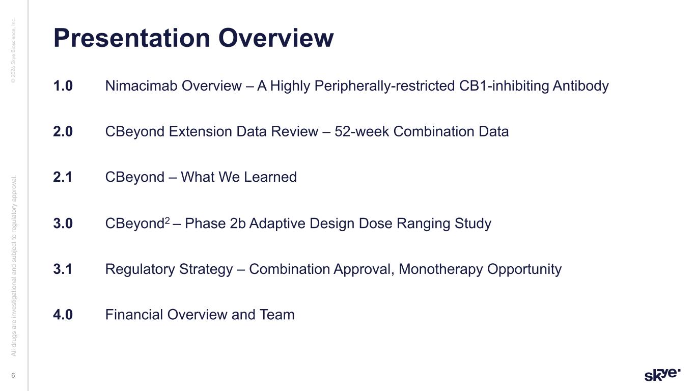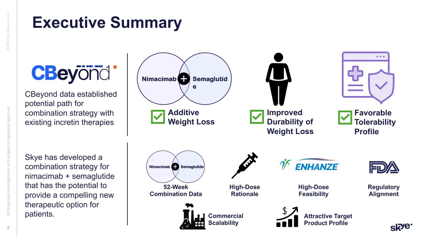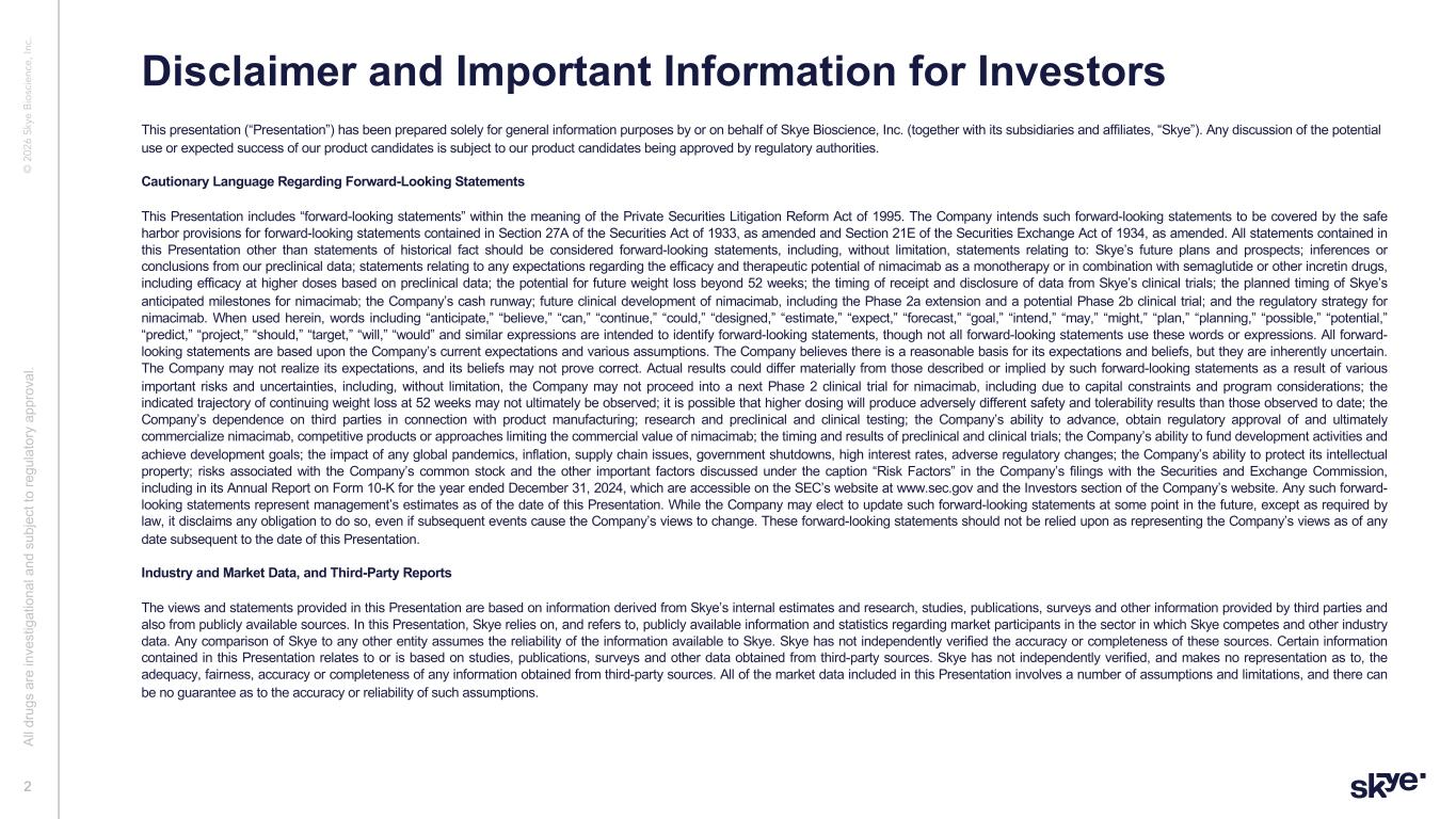 © 2 02 6 Sk ye B io sc ie nc e, In c. This presentation (“Presentation”) has been prepared solely for general information purposes by or on behalf of Skye Bioscience, Inc. (together with its subsidiaries and affiliates, “Skye”). Any discussion of the potential use or expected success of our product candidates is subject to our product candidates being approved by regulatory authorities. Cautionary Language Regarding Forward-Looking Statements This Presentation includes “forward-looking statements” within the meaning of the Private Securities Litigation Reform Act of 1995. The Company intends such forward-looking statements to be covered by the safe harbor provisions for forward-looking statements contained in Section 27A of the Securities Act of 1933, as amended and Section 21E of the Securities Exchange Act of 1934, as amended. All statements contained in this Presentation other than statements of historical fact should be considered forward-looking statements, including, without limitation, statements relating to: Skye’s future plans and prospects; inferences or conclusions from our preclinical data; statements relating to any expectations regarding the efficacy and therapeutic potential of nimacimab as a monotherapy or in combination with semaglutide or other incretin drugs, including efficacy at higher doses based on preclinical data; the potential for future weight loss beyond 52 weeks; the timing of receipt and disclosure of data from Skye’s clinical trials; the planned timing of Skye’s anticipated milestones for nimacimab; the Company’s cash runway; future clinical development of nimacimab, including the Phase 2a extension and a potential Phase 2b clinical trial; and the regulatory strategy for nimacimab. When used herein, words including “anticipate,” “believe,” “can,” “continue,” “could,” “designed,” “estimate,” “expect,” “forecast,” “goal,” “intend,” “may,” “might,” “plan,” “planning,” “possible,” “potential,” “predict,” “project,” “should,” “target,” “will,” “would” and similar expressions are intended to identify forward-looking statements, though not all forward-looking statements use these words or expressions. All forward- looking statements are based upon the Company’s current expectations and various assumptions. The Company believes there is a reasonable basis for its expectations and beliefs, but they are inherently uncertain. The Company may not realize its expectations, and its beliefs may not prove correct. Actual results could differ materially from those described or implied by such forward-looking statements as a result of various important risks and uncertainties, including, without limitation, the Company may not proceed into a next Phase 2 clinical trial for nimacimab, including due to capital constraints and program considerations; the indicated trajectory of continuing weight loss at 52 weeks may not ultimately be observed; it is possible that higher dosing will produce adversely different safety and tolerability results than those observed to date; the Company’s dependence on third parties in connection with product manufacturing; research and preclinical and clinical testing; the Company’s ability to advance, obtain regulatory approval of and ultimately commercialize nimacimab, competitive products or approaches limiting the commercial value of nimacimab; the timing and results of preclinical and clinical trials; the Company’s ability to fund development activities and achieve development goals; the impact of any global pandemics, inflation, supply chain issues, government shutdowns, high interest rates, adverse regulatory changes; the Company’s ability to protect its intellectual property; risks associated with the Company’s common stock and the other important factors discussed under the caption “Risk Factors” in the Company’s filings with the Securities and Exchange Commission, including in its Annual Report on Form 10-K for the year ended December 31, 2024, which are accessible on the SEC’s website at www.sec.gov and the Investors section of the Company’s website. Any such forward- looking statements represent management’s estimates as of the date of this Presentation. While the Company may elect to update such forward-looking statements at some point in the future, except as required by law, it disclaims any obligation to do so, even if subsequent events cause the Company’s views to change. These forward-looking statements should not be relied upon as representing the Company’s views as of any date subsequent to the date of this Presentation. Industry and Market Data, and Third-Party Reports The views and statements provided in this Presentation are based on information derived from Skye’s internal estimates and research, studies, publications, surveys and other information provided by third parties and also from publicly available sources. In this Presentation, Skye relies on, and refers to, publicly available information and statistics regarding market participants in the sector in which Skye competes and other industry data. Any comparison of Skye to any other entity assumes the reliability of the information available to Skye. Skye has not independently verified the accuracy or completeness of these sources. Certain information contained in this Presentation relates to or is based on studies, publications, surveys and other data obtained from third-party sources. Skye has not independently verified, and makes no representation as to, the adequacy, fairness, accuracy or completeness of any information obtained from third-party sources. All of the market data included in this Presentation involves a number of assumptions and limitations, and there can be no guarantee as to the accuracy or reliability of such assumptions. Disclaimer and Important Information for Investors 2 Al l d ru gs a re in ve st ig at io 
