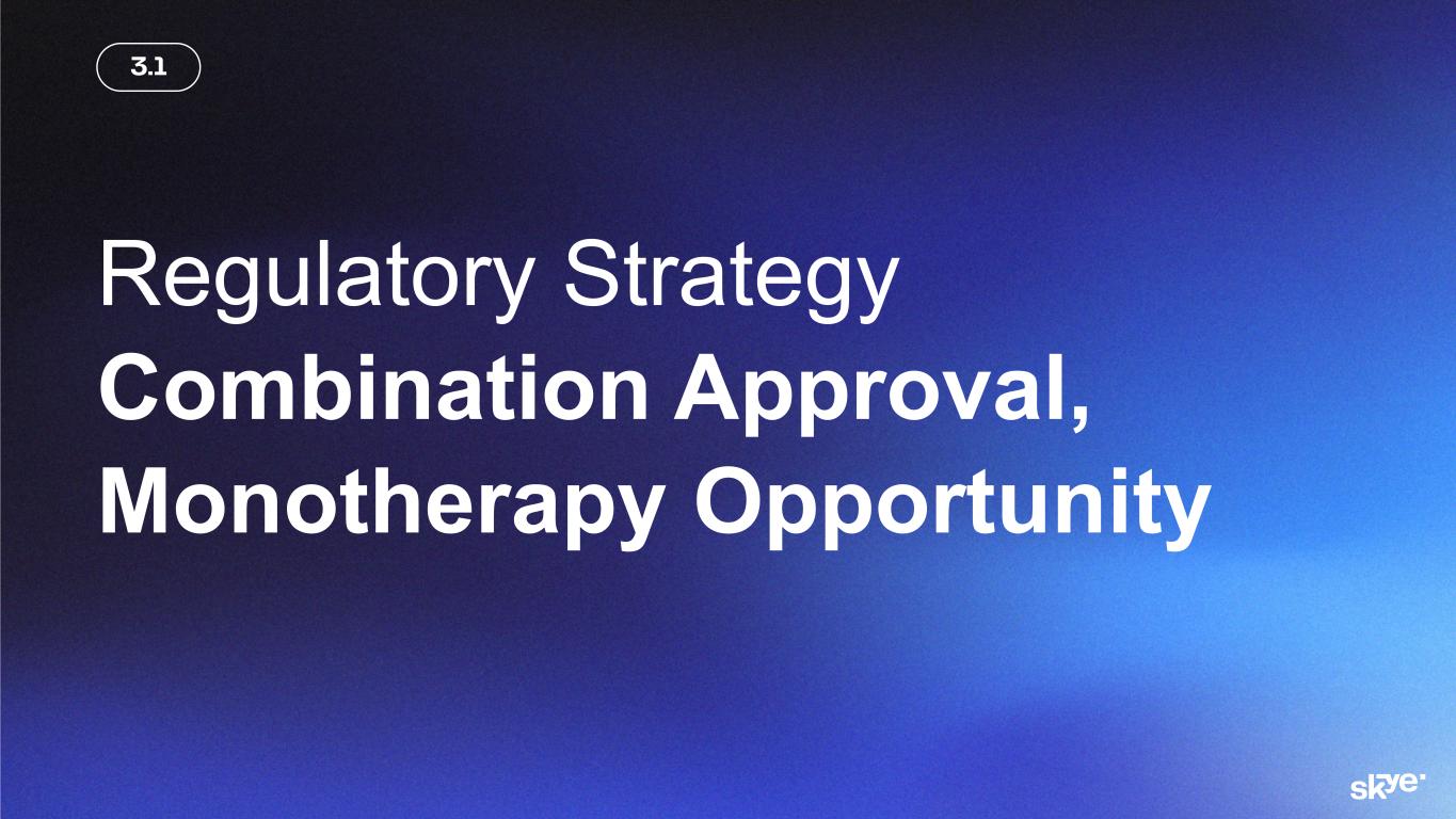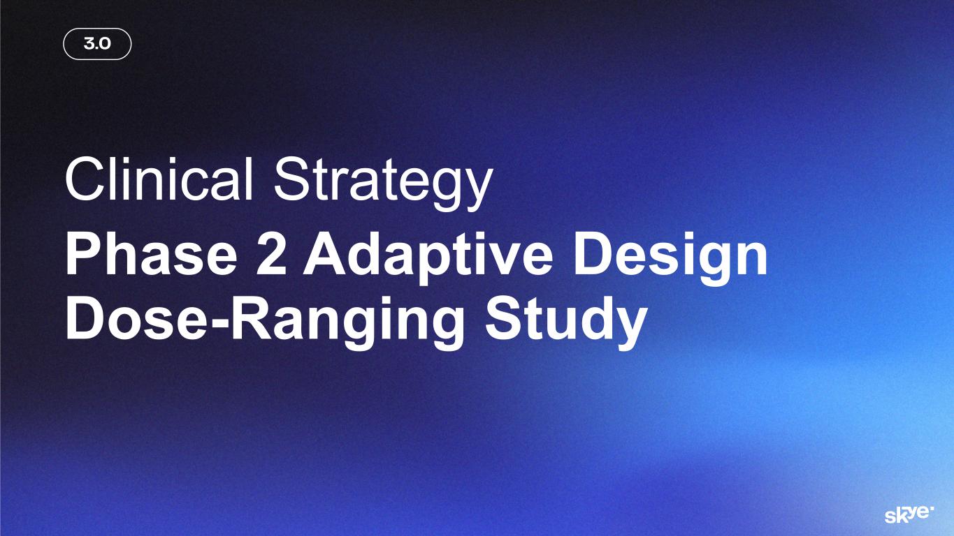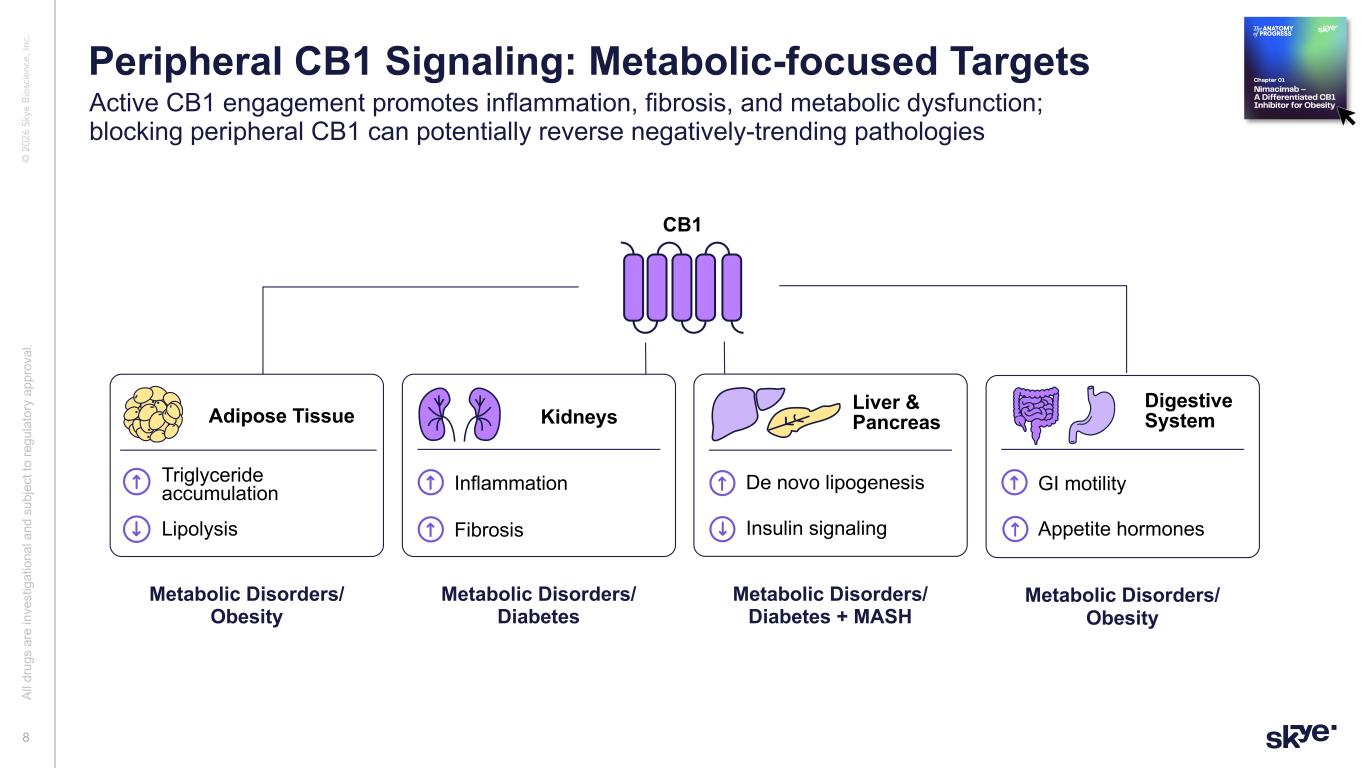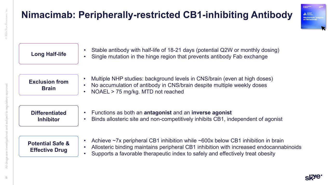 © 2 02 6 Sk ye B io sc ie nc e, In c. This presentation (“Presentation”) has been prepared solely for general information purposes by or on behalf of Skye Bioscience, Inc. (together with its subsidiaries and affiliates, “Skye”). Any discussion of the potential use or expected success of our product candidates is subject to our product candidates being approved by regulatory authorities. Cautionary Language Regarding Forward-Looking Statements This Presentation includes “forward-looking statements” within the meaning of the Private Securities Litigation Reform Act of 1995. The Company intends such forward-looking statements to be covered by the safe harbor provisions for forward-looking statements contained in Section 27A of the Securities Act of 1933, as amended and Section 21E of the Securities Exchange Act of 1934, as amended. All statements contained in this Presentation other than statements of historical fact should be considered forward-looking statements, including, without limitation, statements relating to: Skye’s future plans and prospects; inferences or conclusions from our preclinical data; statements relating to any expectations regarding the efficacy and therapeutic potential of nimacimab as a monotherapy or in combination with semaglutide or other incretin drugs, including efficacy at higher doses based on preclinical data; the potential for future weight loss beyond 52 weeks; the timing of receipt and disclosure of data from Skye’s clinical trials; the planned timing of Skye’s anticipated milestones for nimacimab; the Company’s cash runway; future clinical development of nimacimab, including the Phase 2a extension and a potential Phase 2b clinical trial; and the regulatory strategy for nimacimab. When used herein, words including “anticipate,” “believe,” “can,” “continue,” “could,” “designed,” “estimate,” “expect,” “forecast,” “goal,” “intend,” “may,” “might,” “plan,” “planning,” “possible,” “potential,” “predict,” “project,” “should,” “target,” “will,” “would” and similar expressions are intended to identify forward-looking statements, though not all forward-looking statements use these words or expressions. All forward- looking statements are based upon the Company’s current expectations and various assumptions. The Company believes there is a reasonable basis for its expectations and beliefs, but they are inherently uncertain. The Company may not realize its expectations, and its beliefs may not prove correct. Actual results could differ materially from those described or implied by such forward-looking statements as a result of various important risks and uncertainties, including, without limitation, the Company may not proceed into a next Phase 2 clinical trial for nimacimab, including due to capital constraints and program considerations; the indicated trajectory of continuing weight loss at 52 weeks may not ultimately be observed; it is possible that higher dosing will produce adversely different safety and tolerability results than those observed to date; the Company’s dependence on third parties in connection with product manufacturing; research and preclinical and clinical testing; the Company’s ability to advance, obtain regulatory approval of and ultimately commercialize nimacimab, competitive products or approaches limiting the commercial value of nimacimab; the timing and results of preclinical and clinical trials; the Company’s ability to fund development activities and achieve development goals; the impact of any global pandemics, inflation, supply chain issues, government shutdowns, high interest rates, adverse regulatory changes; the Company’s ability to protect its intellectual property; risks associated with the Company’s common stock and the other important factors discussed under the caption “Risk Factors” in the Company’s filings with the Securities and Exchange Commission, including in its Annual Report on Form 10-K for the year ended December 31, 2024, which are accessible on the SEC’s website at www.sec.gov and the Investors section of the Company’s website. Any such forward- looking statements represent management’s estimates as of the date of this Presentation. While the Company may elect to update such forward-looking statements at some point in the future, except as required by law, it disclaims any obligation to do so, even if subsequent events cause the Company’s views to change. These forward-looking statements should not be relied upon as representing the Company’s views as of any date subsequent to the date of this Presentation. Industry and Market Data, and Third-Party Reports The views and statements provided in this Presentation are based on information derived from Skye’s internal estimates and research, studies, publications, surveys and other information provided by third parties and also from publicly available sources. In this Presentation, Skye relies on, and refers to, publicly available information and statistics regarding market participants in the sector in which Skye competes and other industry data. Any comparison of Skye to any other entity assumes the reliability of the information available to Skye. Skye has not independently verified the accuracy or completeness of these sources. Certain information contained in this Presentation relates to or is based on studies, publications, surveys and other data obtained from third-party sources. Skye has not independently verified, and makes no representation as to, the adequacy, fairness, accuracy or completeness of any information obtained from third-party sources. All of the market data included in this Presentation involves a number of assumptions and limitations, and there can be no guarantee as to the accuracy or reliability of such assumptions. Disclaimer and Important Information for Investors 2 Al l d ru gs a re in ve st ig at io 