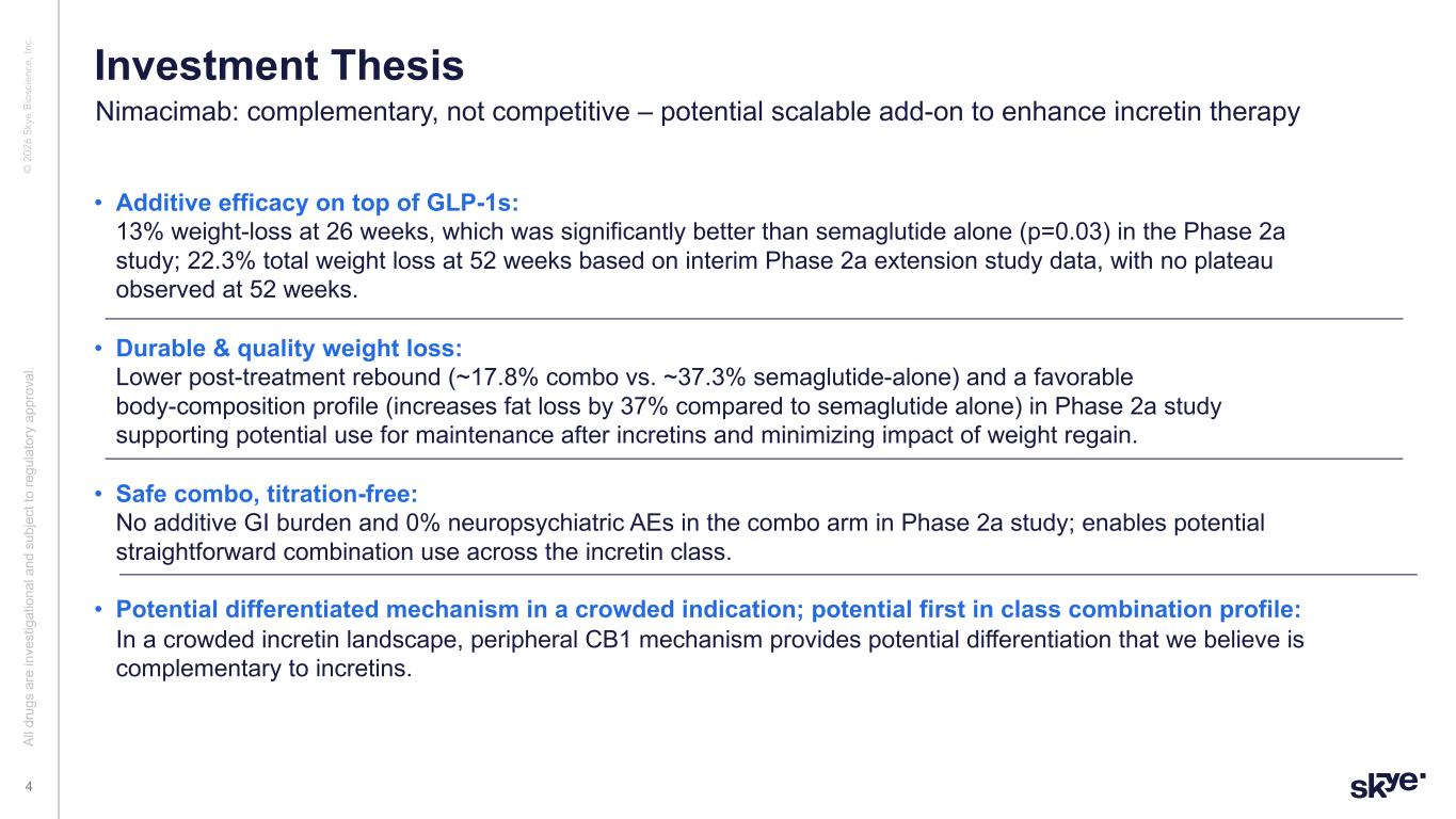 © 2 02 6 Sk ye B io sc ie nc e, In c. Executive Summary Al l d ru gs a re in ve st ig at io na l a nd s ub je ct to re gu la to ry a pp ro va l. 3 Nimacimab Semaglutid e Additive Weight Loss Favorable Tolerability Profile CBeyond data established potential path for combination strategy with existing incretin therapies Skye has developed a combination strategy for nimacimab + semaglutide that has the potential to provide a compelling new therapeutic option for patients. 52-Week Combination Data High-Dose Rationale High-Dose Feasibility Regulatory Alignment Commercial Scalability Attractive Target Product Profile Improved Durability of Weight Loss