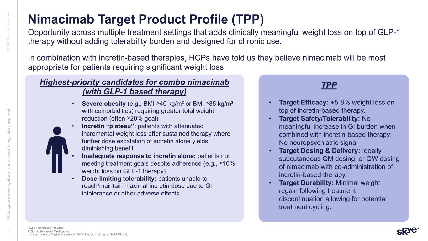 © 2 02 6 Sk ye B io sc ie nc e, In c. Al l d ru gs a re in ve st ig at io na l a nd s ub je ct to re gu la to ry a pp ro va l. 4 Nimacimab: complementary, not competitive – potential scalable add-on to enhance incretin therapy • Additive efficacy on top of GLP-1s: 13% weight-loss at 26 weeks, which was significantly better than semaglutide alone (p=0.03) in the Phase 2a study; 22.3% total weight loss at 52 weeks based on interim Phase 2a extension study data, with no plateau observed at 52 weeks. • Durable & quality weight loss: Lower post-treatment rebound (~17.8% combo vs. ~37.3% semaglutide-alone) and a favorable body-composition profile (increases fat loss by 37% compared to semaglutide alone) in Phase 2a study supporting potential use for maintenance after incretins and minimizing impact of weight regain. • Safe combo, titration-free: No additive GI burden and 0% neuropsychiatric AEs in the combo arm in Phase 2a study; enables potential straightforward combination use across the incretin class. • Potential differentiated mechanism in a crowded indication; potential first in class combination profile: In a crowded incretin landscape, peripheral CB1 mechanism provides potential differentiation that we believe is complementary to incretins. Investment Thesis