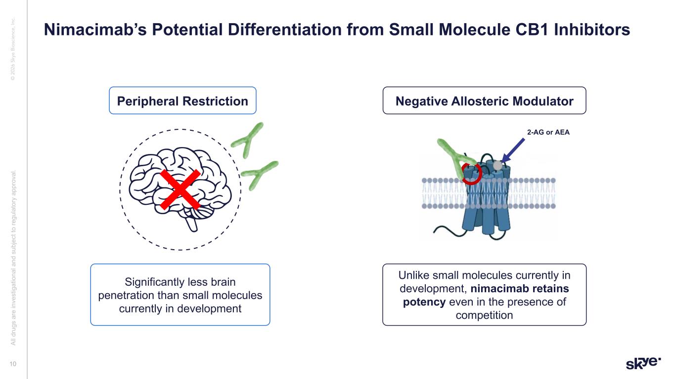 © 2 02 6 Sk ye B io sc ie nc e, In c. Long Half-life Potential Safe & Effective Drug Exclusion from Brain • Stable antibody with half-life of 18-21 days (potential Q2W or monthly dosing) • Single mutation in the hinge region that prevents antibody Fab exchange • Multiple NHP studies: background levels in CNS/brain (even at high doses) • No accumulation of antibody in CNS/brain despite multiple weekly doses • NOAEL > 75 mg/kg. MTD not reached • Achieve ~7x peripheral CB1 inhibition while ~600x below CB1 inhibition in brain • Allosteric binding maintains peripheral CB1 inhibition with increased endocannabinoids • Supports a favorable therapeutic index to safely and effectively treat obesity Differentiated Inhibitor • Functions as both an antagonist and an inverse agonist • Binds allosteric site and non-competitively inhibits CB1, independent of agonist 9 Nimacimab: Peripherally-restricted CB1-inhibiting Antibody Al l d ru gs a re in ve st ig at io na l a nd s ub je ct to re gu la to ry a pp ro va l.