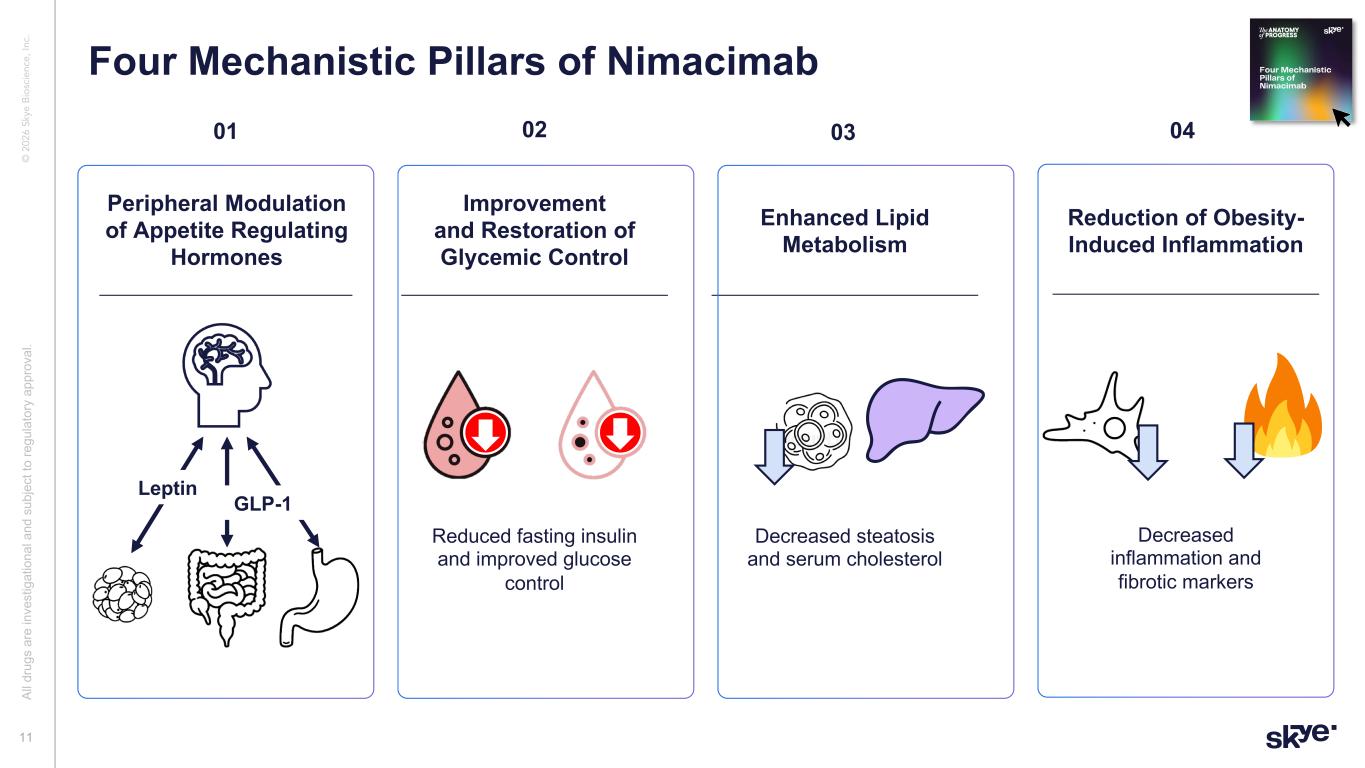 © 2 02 6 Sk ye B io sc ie nc e, In c. 2-AG or AEA Negative Allosteric Modulator Significantly less brain penetration than small molecules currently in development Unlike small molecules currently in development, nimacimab retains potency even in the presence of competition Peripheral Restriction Al l d ru gs a re in ve st ig at io na l a nd s ub je ct to re gu la to ry a pp ro va l. 10 Nimacimab’s Potential Differentiation from Small Molecule CB1 Inhibitors