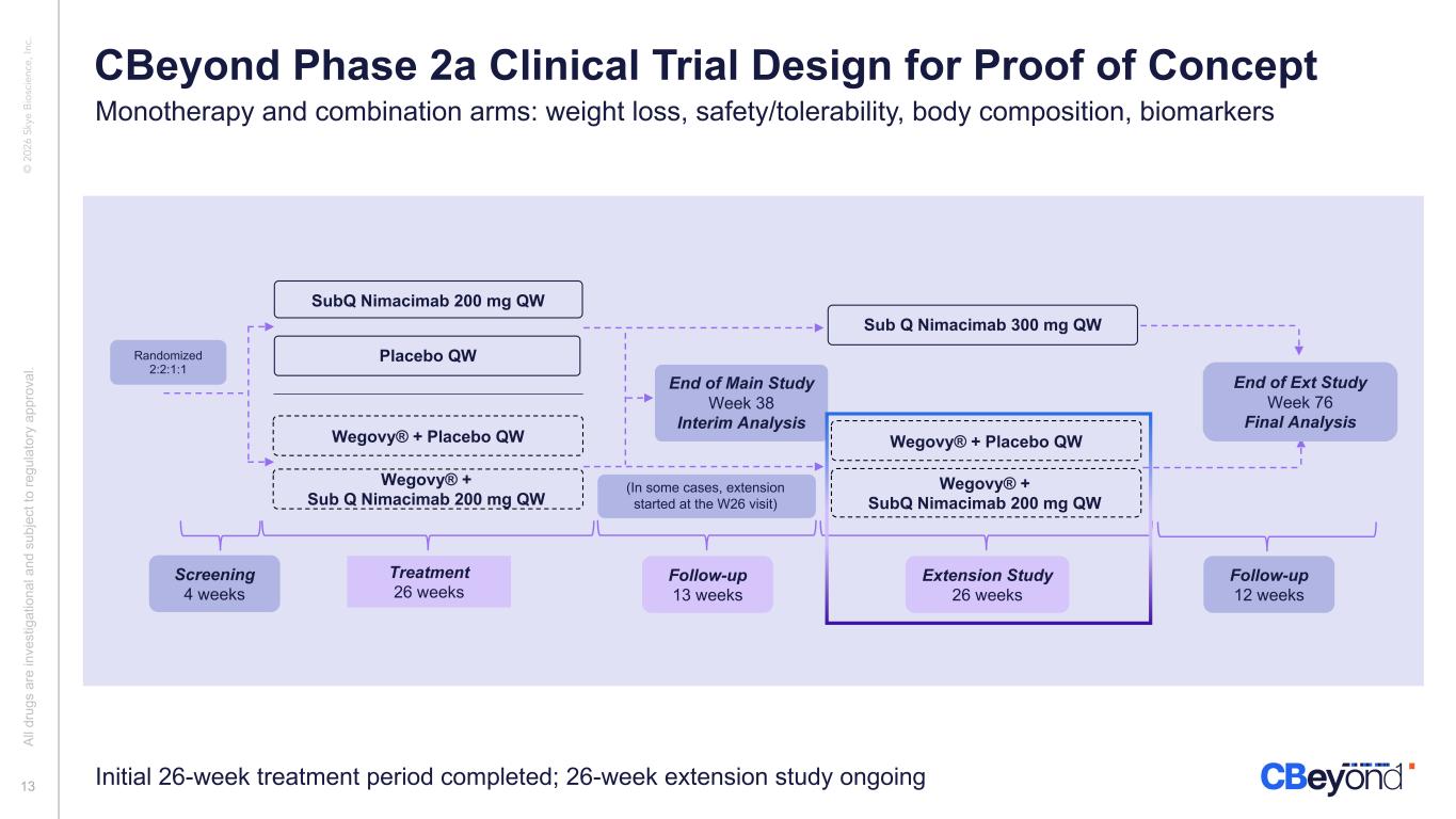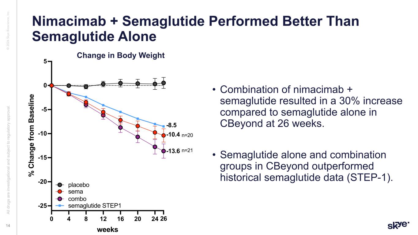 © 2 02 6 Sk ye B io sc ie nc e, In c. SubQ Nimacimab 200 mg QW Treatment 26 weeks Follow-up 13 weeks End of Main Study Week 38 Interim Analysis Placebo QW Wegovy® + Placebo QW Wegovy® + Sub Q Nimacimab 200 mg QW Extension Study 26 weeks Follow-up 12 weeks Wegovy® + SubQ Nimacimab 200 mg QW Sub Q Nimacimab 300 mg QW End of Ext Study Week 76 Final Analysis Wegovy® + Placebo QW Screening 4 weeks (In some cases, extension started at the W26 visit) Initial 26-week treatment period completed; 26-week extension study ongoing Randomized 2:2:1:1 Al l d ru gs a re in ve st ig at io na l a nd s ub je ct to re gu la to ry a pp ro va l. 13 CBeyond Phase 2a Clinical Trial Design for Proof of Concept Monotherapy and combination arms: weight loss, safety/tolerability, body composition, biomarkers