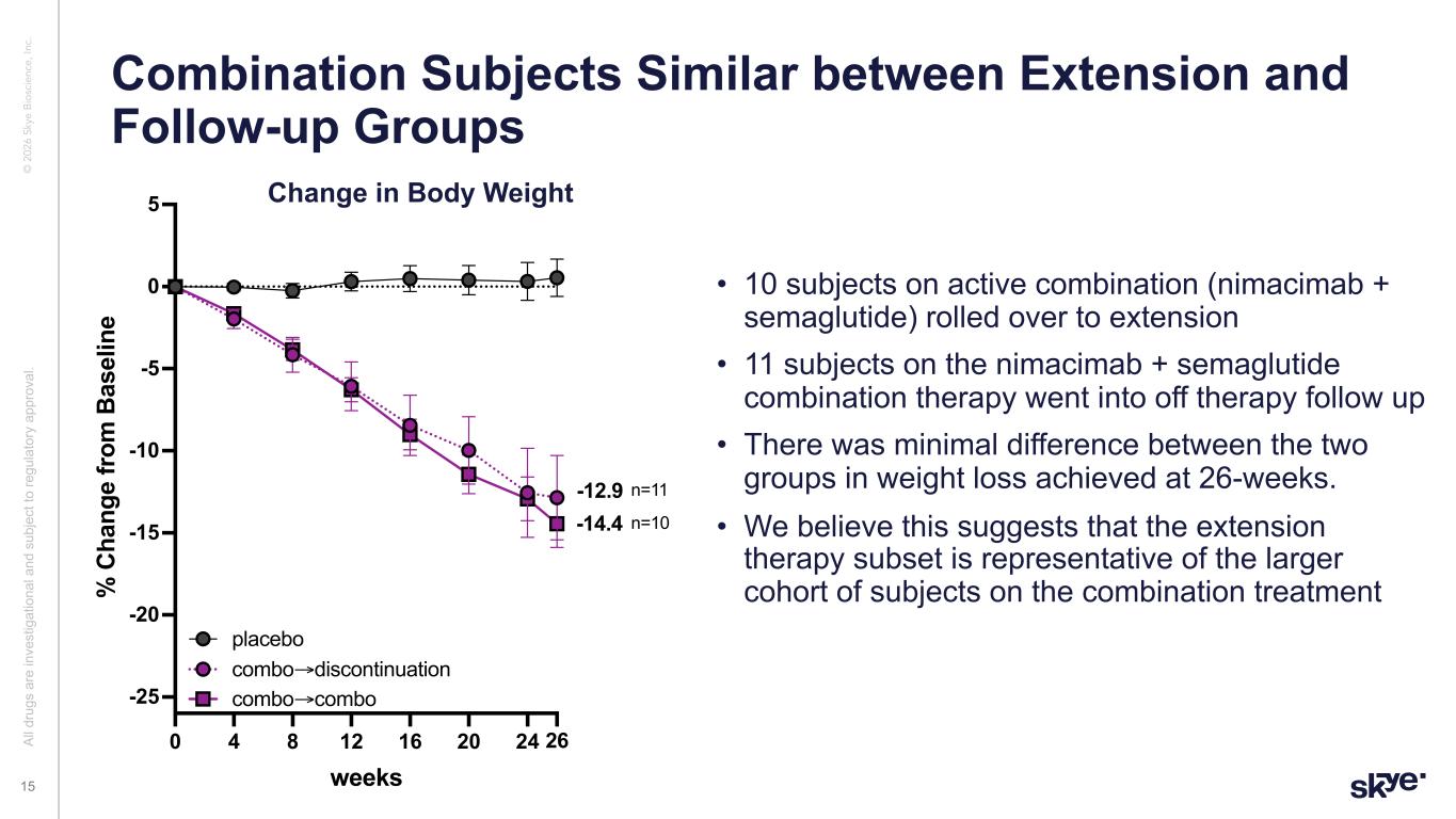 © 2 02 6 Sk ye B io sc ie nc e, In c. • 10 subjects on active combination (nimacimab + semaglutide) rolled over to extension • 11 subjects on the nimacimab + semaglutide combination therapy went into off therapy follow up • There was minimal difference between the two groups in weight loss achieved at 26-weeks. • We believe this suggests that the extension therapy subset is representative of the larger cohort of subjects on the combination treatment Combination Subjects Similar between Extension and Follow-up Groups Al l d ru gs a re in ve st ig at io na l a nd s ub je ct to re gu la to ry a pp ro va l. 15 0 4 8 12 16 20 24 26 -25 -20 -15 -10 -5 0 5 weeks % C ha ng e fr om B as el in e combo 2 groups combo→discontinuation placebo combo→combo -14.4 -12.9 n=11 n=10 Change in Body Weight