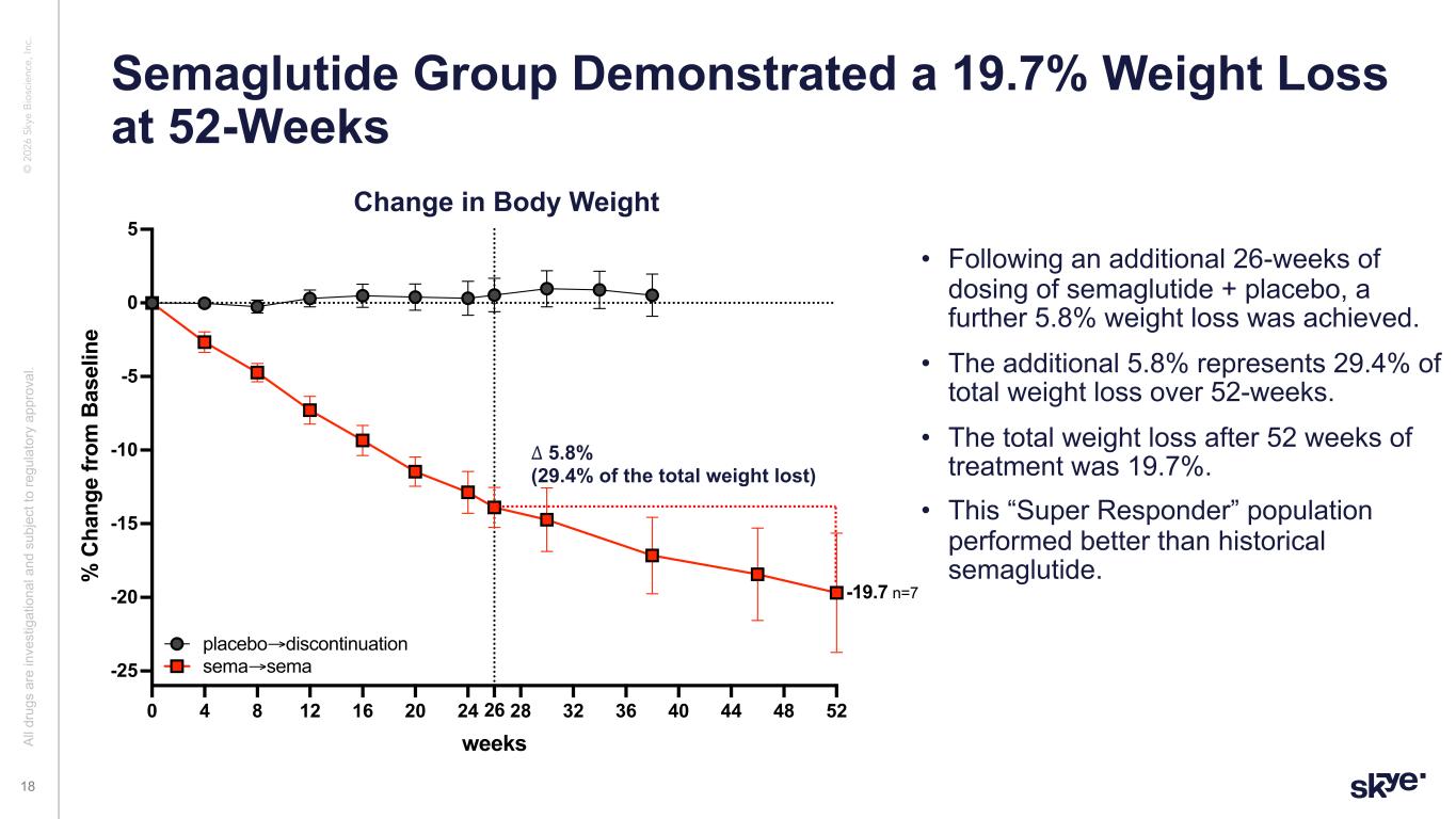 © 2 02 6 Sk ye B io sc ie nc e, In c. • 9 subjects in the semaglutide alone (with placebo) arm enrolled in the extension study. • 11 subjects in the semaglutide arm went into off therapy follow • There was a marked difference in weight loss between these two groups at week 26 (85% greater weigh loss in the extension subset) • This suggest that subset in extension treatment was not representative of the larger cohort and also differs from the historical response to semaglutide • Subjects who were doing well on semaglutide chose to participate in the extension study • This subset is a self-selected high-responder population (i.e. Super Responders). Semaglutide Subjects Were Different Between Extension and Follow-Up Al l d ru gs a re in ve st ig at io na l a nd s ub je ct to re gu la to ry a pp ro va l. 17 Change in Body Weight 0 4 8 12 16 20 24 26 -25 -20 -15 -10 -5 0 5 weeks % C ha ng e fr om B as el in e sema extension + rebound wk26 +STEP sema→discontinuation placebo→discontinuation sema→sema -7.5 -13.9 n=11 n=9 semaglutide STEP1 -8.5 Placebo adjusted, PP