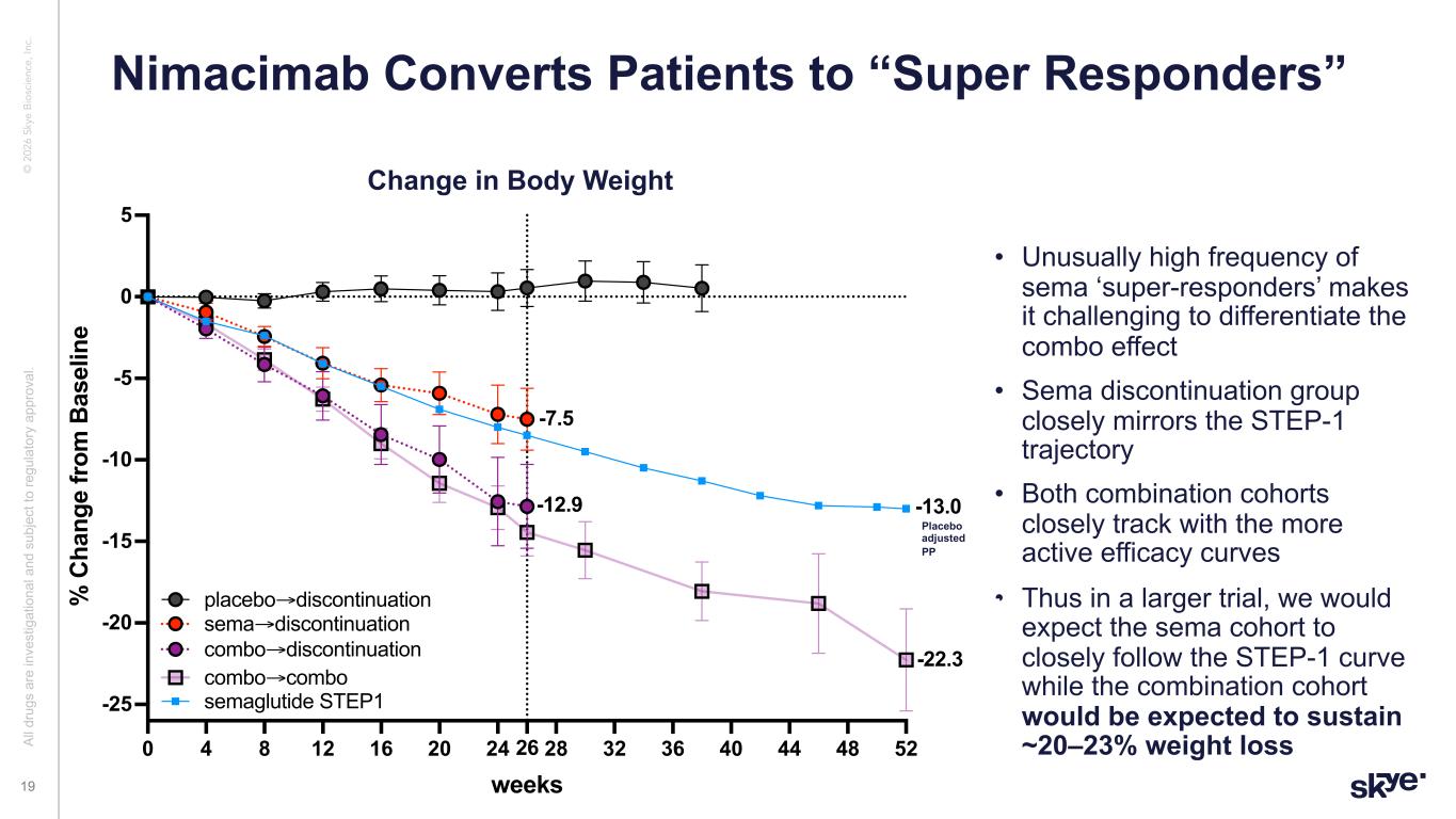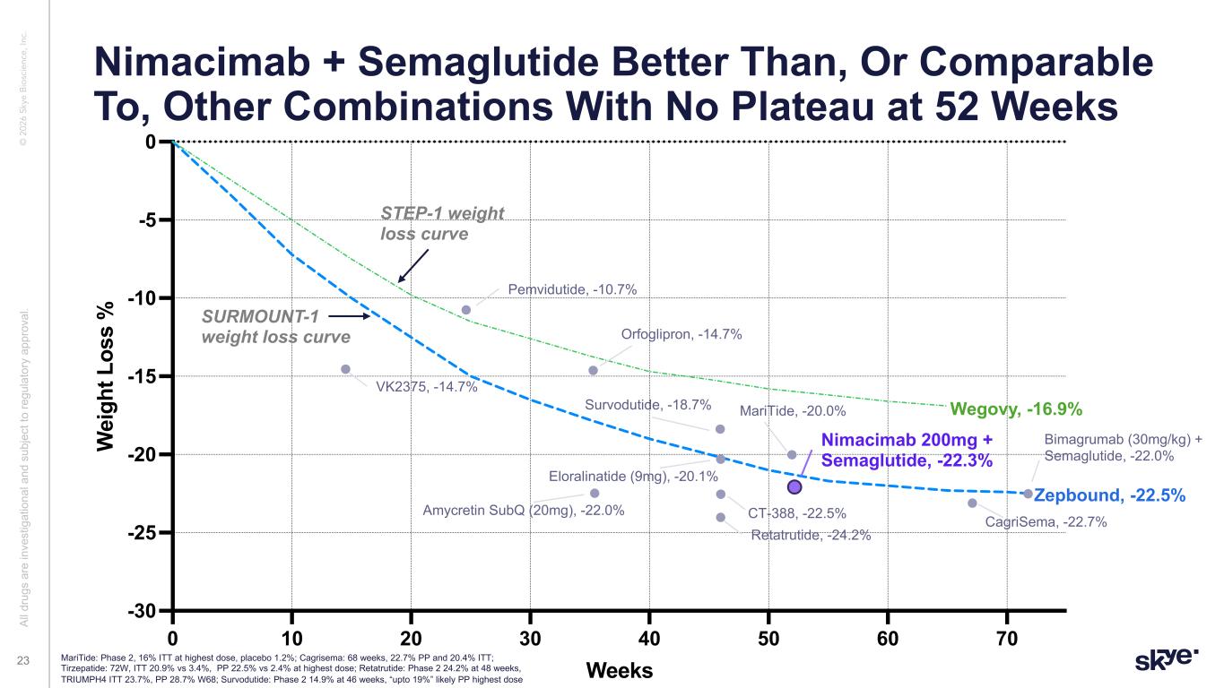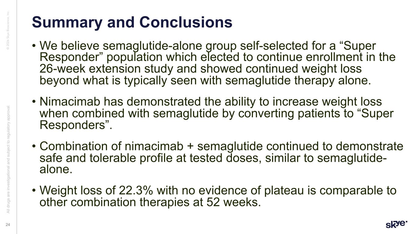 © 2 02 6 Sk ye B io sc ie nc e, In c. Nimacimab + Semaglutide Better Than, Or Comparable To, Other Combinations With No Plateau at 52 Weeks Al l d ru gs a re in ve st ig at io na l a nd s ub je ct to re gu la to ry a pp ro va l. 23 0 10 20 30 40 50 60 70 -30 -25 -20 -15 -10 -5 0 Weeks W ei gh t L os s % Wegovy, -16.9% Zepbound, -22.5% Nimacimab 200mg + Semaglutide, -22.3% Retatrutide, -24.2% Eloralinatide (9mg), -20.1% CT-388, -22.5% CagriSema, -22.7% Orfoglipron, -14.7% MariTide, -20.0%Survodutide, -18.7% Bimagrumab (30mg/kg) + Semaglutide, -22.0% STEP-1 weight loss curve SURMOUNT-1 weight loss curve Amycretin SubQ (20mg), -22.0% VK2375, -14.7% Pemvidutide, -10.7% MariTide: Phase 2, 16% ITT at highest dose, placebo 1.2%; Cagrisema: 68 weeks, 22.7% PP and 20.4% ITT; Tirzepatide: 72W, ITT 20.9% vs 3.4%, PP 22.5% vs 2.4% at highest dose; Retatrutide: Phase 2 24.2% at 48 weeks, TRIUMPH4 ITT 23.7%, PP 28.7% W68; Survodutide: Phase 2 14.9% at 46 weeks, “upto 19%” likely PP highest dose