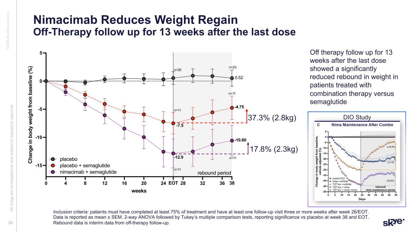 © 2 02 6 Sk ye B io sc ie nc e, In c. • Unusually high frequency of sema ‘super-responders’ makes it challenging to differentiate the combo effect • Sema discontinuation group closely mirrors the STEP-1 trajectory • Both combination cohorts closely track with the more active efficacy curves • Thus in a larger trial, we would expect the sema cohort to closely follow the STEP-1 curve while the combination cohort would be expected to sustain ~20–23% weight loss Nimacimab Converts Patients to “Super Responders” Al l d ru gs a re in ve st ig at io na l a nd s ub je ct to re gu la to ry a pp ro va l. 19 Change in Body Weight Placebo adjusted PP n=7 0 4 8 12 16 20 24 28 32 36 40 44 48 5226 -25 -20 -15 -10 -5 0 5 weeks % C ha ng e fr om B as el in e Copy of rebound up to wk26 and extrebound extension and STEP1 veh adjusted sema→discontinuation combo→discontinuation placebo→discontinuation semaglutide STEP1 -22.3 -13.0 combo→combo -7.5 -12.9