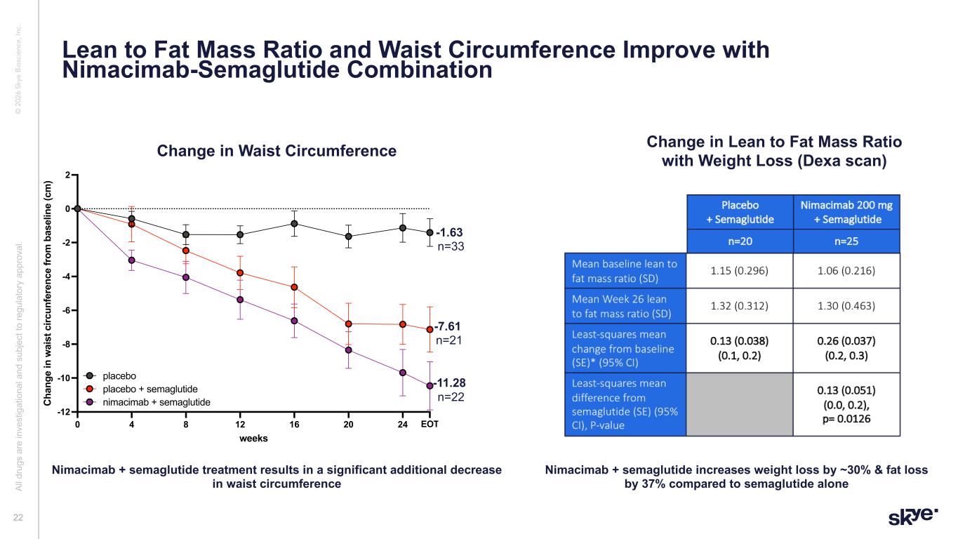 © 2 02 6 Sk ye B io sc ie nc e, In c. Nimacimab Reduces Weight Regain Off-Therapy follow up for 13 weeks after the last dose Al l d ru gs a re in ve st ig at io na l a nd s ub je ct to re gu la to ry a pp ro va l. Inclusion criteria: patients must have completed at least 75% of treatment and have at least one follow-up visit three or more weeks after week 26/EOT. Data is reported as mean ± SEM. 2-way ANOVA followed by Tukey’s multiple comparison tests, reporting significance vs placebo at week 38 and EOT. Rebound data is interim data from off-therapy follow-up. 20 0 4 8 12 16 20 24 28 32 36EOT 38 -15 -10 -5 0 5 weeks C ha ng e in b od y w ei gh t f ro m b as el in e (% ) rebound combos n=11: rebound combos placebo + semaglutide nimacimab + semaglutide placebo 0.52 -4.75 -10.60 n=11 n=11 n=11 n=11 n=23 n=26 -7.5 -12.9 rebound period 37.3% (2.8kg) 17.8% (2.3kg) Off therapy follow up for 13 weeks after the last dose showed a significantly reduced rebound in weight in patients treated with combination therapy versus semaglutide DIO Study