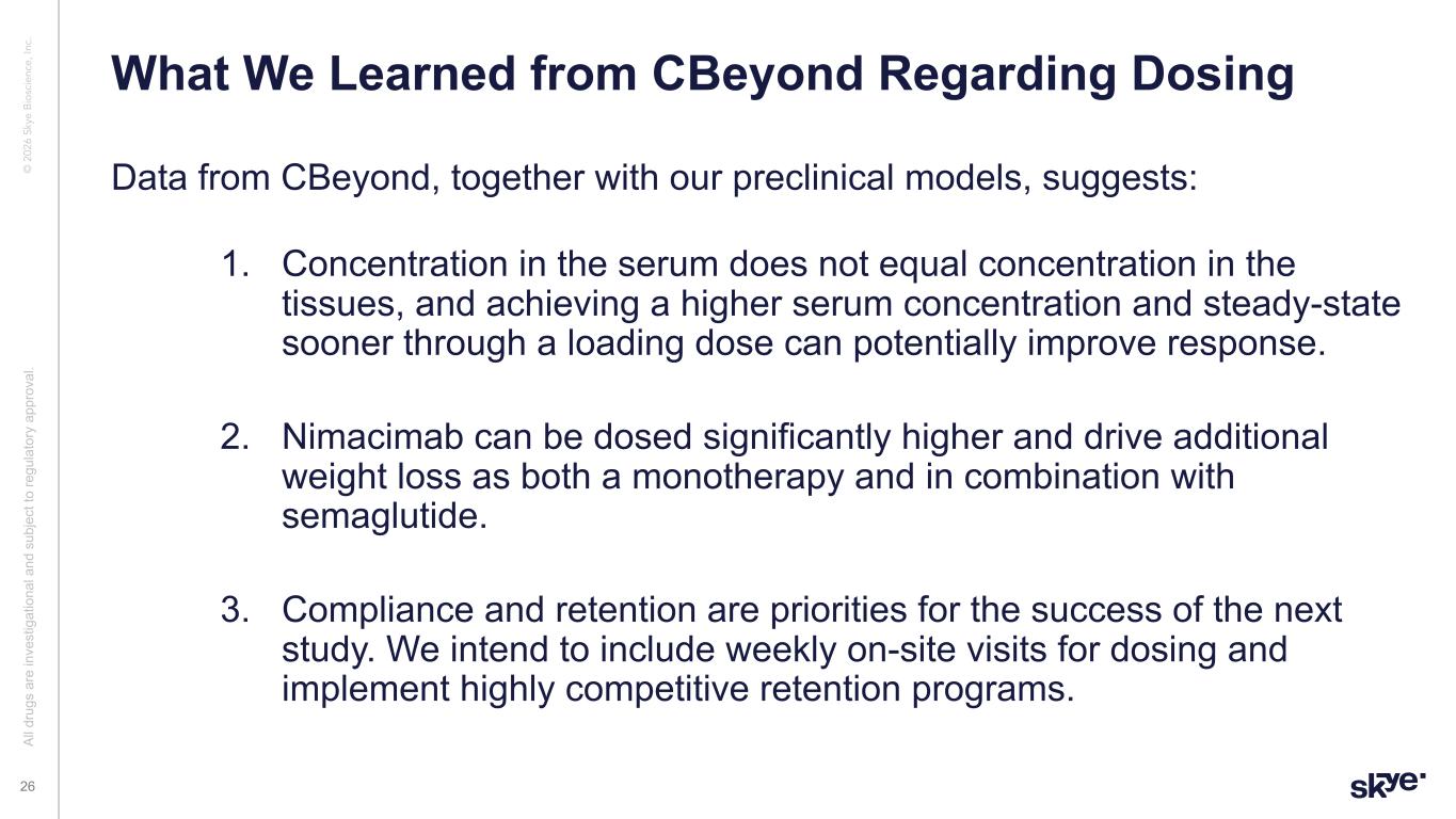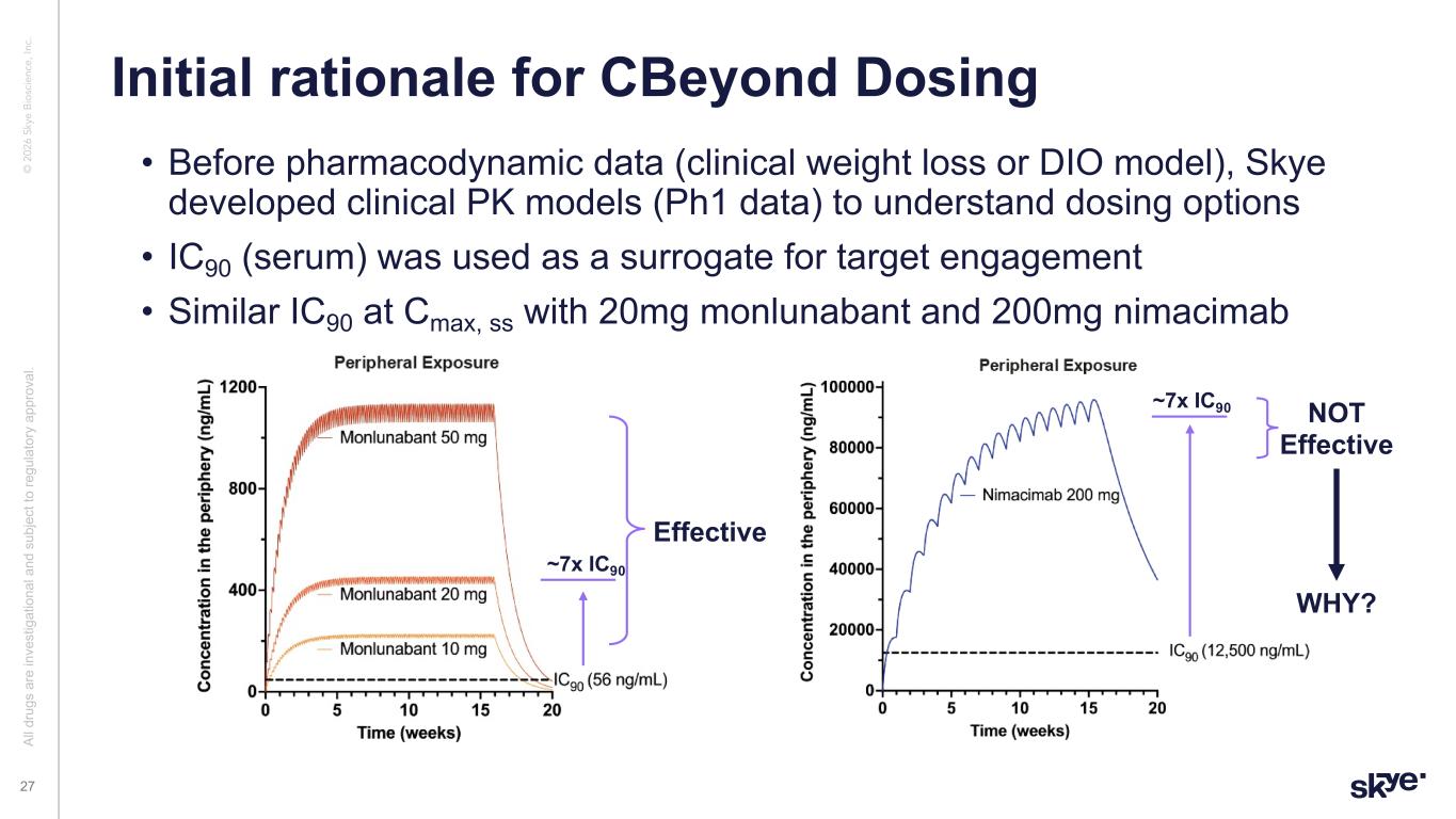 © 2 02 6 Sk ye B io sc ie nc e, In c. Data from CBeyond, together with our preclinical models, suggests: 1. Concentration in the serum does not equal concentration in the tissues, and achieving a higher serum concentration and steady-state sooner through a loading dose can potentially improve response. 2. Nimacimab can be dosed significantly higher and drive additional weight loss as both a monotherapy and in combination with semaglutide. 3. Compliance and retention are priorities for the success of the next study. We intend to include weekly on-site visits for dosing and implement highly competitive retention programs. What We Learned from CBeyond Regarding Dosing Al l d ru gs a re in ve st ig at io na l a nd s ub je ct to re gu la to ry a pp ro va l. 26