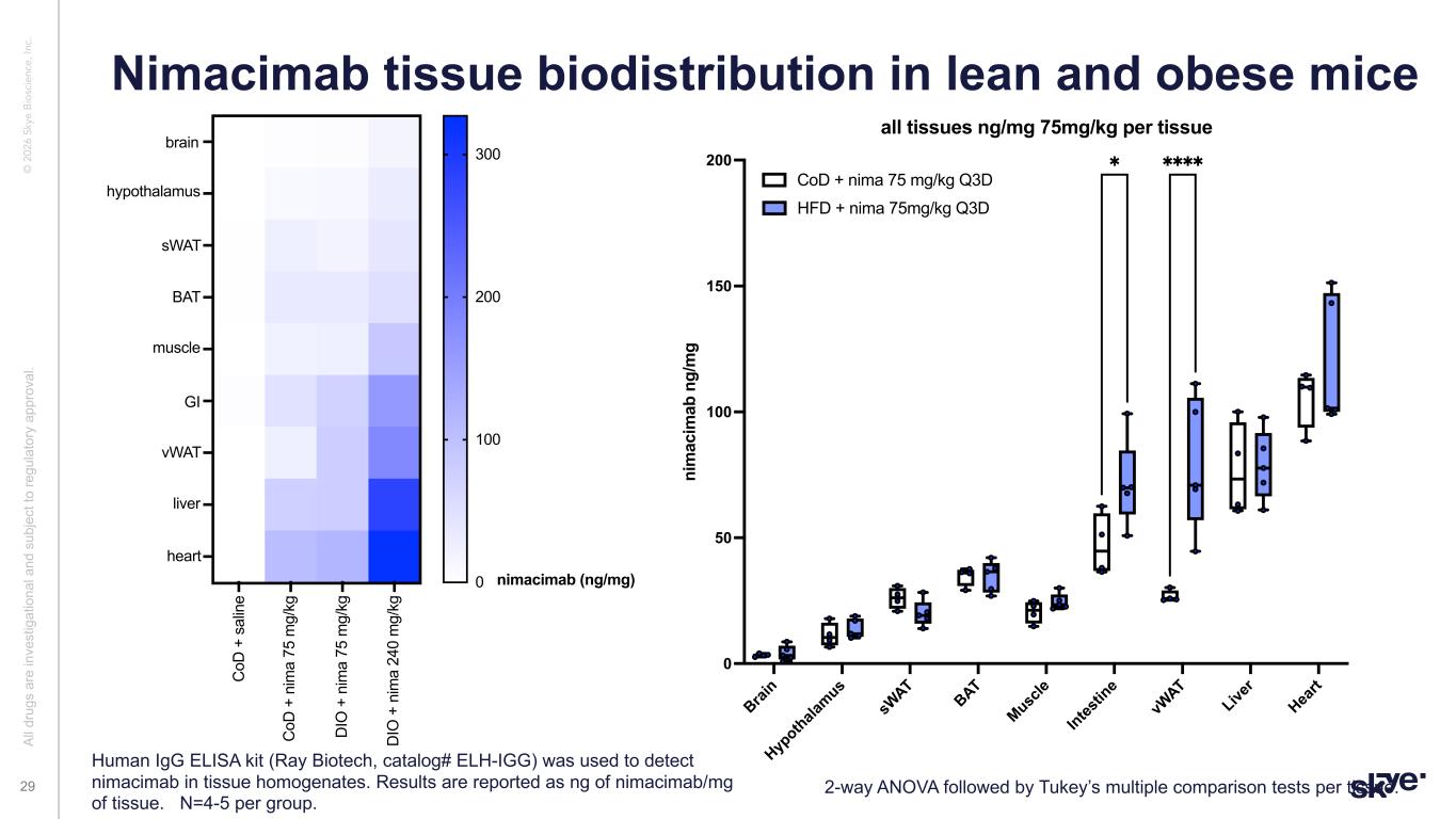 © 2 02 6 Sk ye B io sc ie nc e, In c. Nimacimab biodistribution in lean and obese mice Al l d ru gs a re in ve st ig at io na l a nd s ub je ct to re gu la to ry a pp ro va l. 28 2-way ANOVA followed by Tukey’s multiple comparison tests per tissue. Human IgG ELISA kit (Ray Biotech, catalog# ELH-IGG) was used to detect nimacimab in tissue homogenates. Results are reported as ng of nimacimab/mg of tissue. N=4-5 per group. Brai n Hyp othala mus sW AT BAT Musc le Intes tin e vW AT Live r Hea rt Seru m 0 2000 4000 6000 ni m ac im ab n g/ m g all tissues ng/mg with serum per tissue CoD + saline Q3D CoD + nima 75 mg/kg Q3D HFD + nima 75mg/kg Q3D HFD + nima 240 mg/kg Q3D ✱✱✱✱ ✱✱✱✱ A B C D 1 2 3 4 5 6 7 8 9 10 0 1000 2000 3000 muscle heart GI liver brain nimacimab (ng/mg) hypothalamus BAT sWAT vWAT C oD + s al in e C oD + n im a 75 m g/ kg D IO + n im a 75 m g/ kg D IO + n im a 24 0 m g/ kg 4000 serum