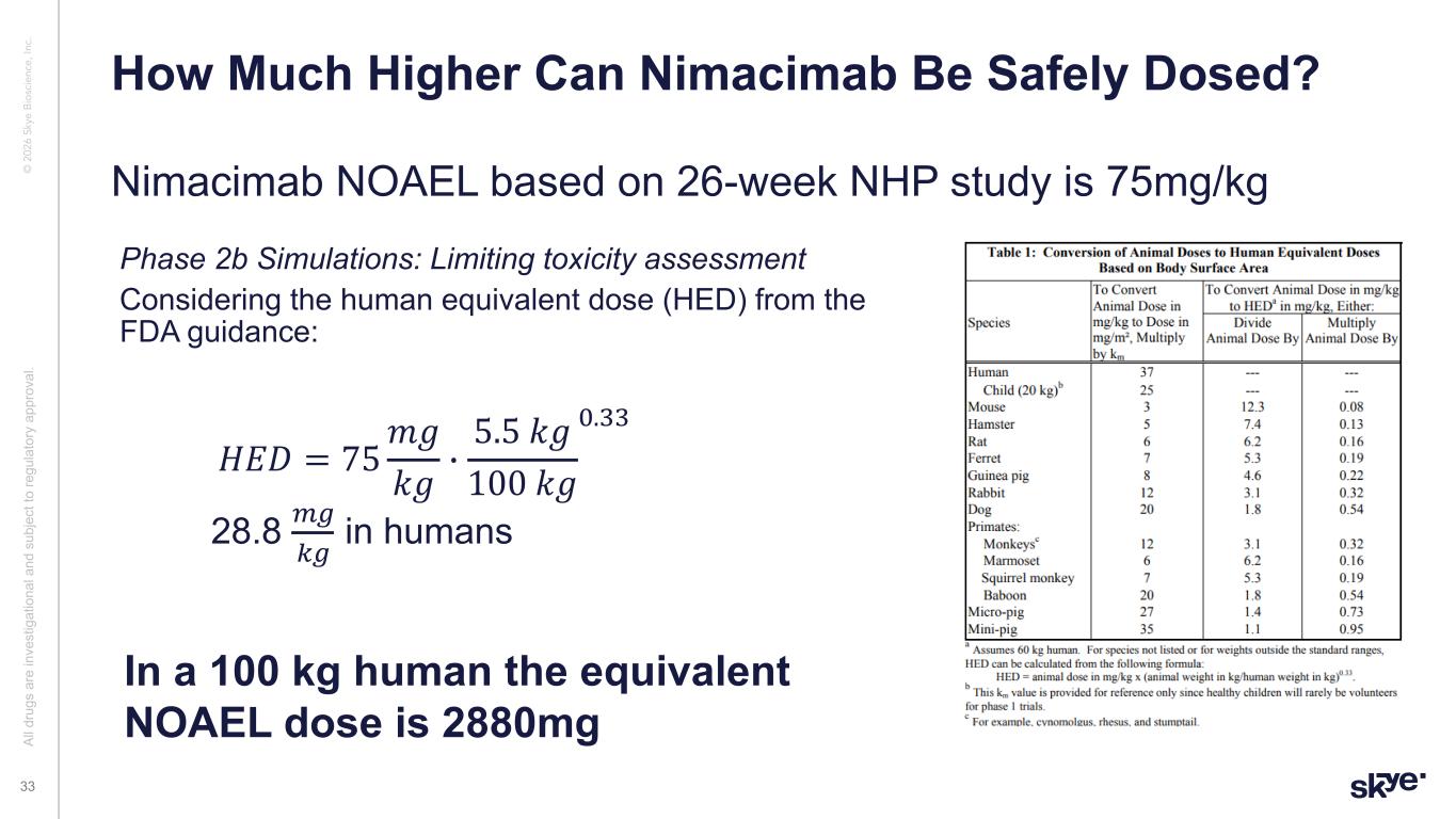 © 2 02 6 Sk ye B io sc ie nc e, In c. Nimacimab NOAEL based on 26-week NHP study is 75mg/kg How Much Higher Can Nimacimab Be Safely Dosed? Al l d ru gs a re in ve st ig at io na l a nd s ub je ct to re gu la to ry a pp ro va l. 33 Phase 2b Simulations: Limiting toxicity assessment Considering the human equivalent dose (HED) from the FDA guidance: 𝐻𝐸𝐷 = 75 𝑚𝑔 𝑘𝑔 * 5.5 𝑘𝑔 100 𝑘𝑔 !.## 28.8 $%&% in humans In a 100 kg human the equivalent NOAEL dose is 2880mg