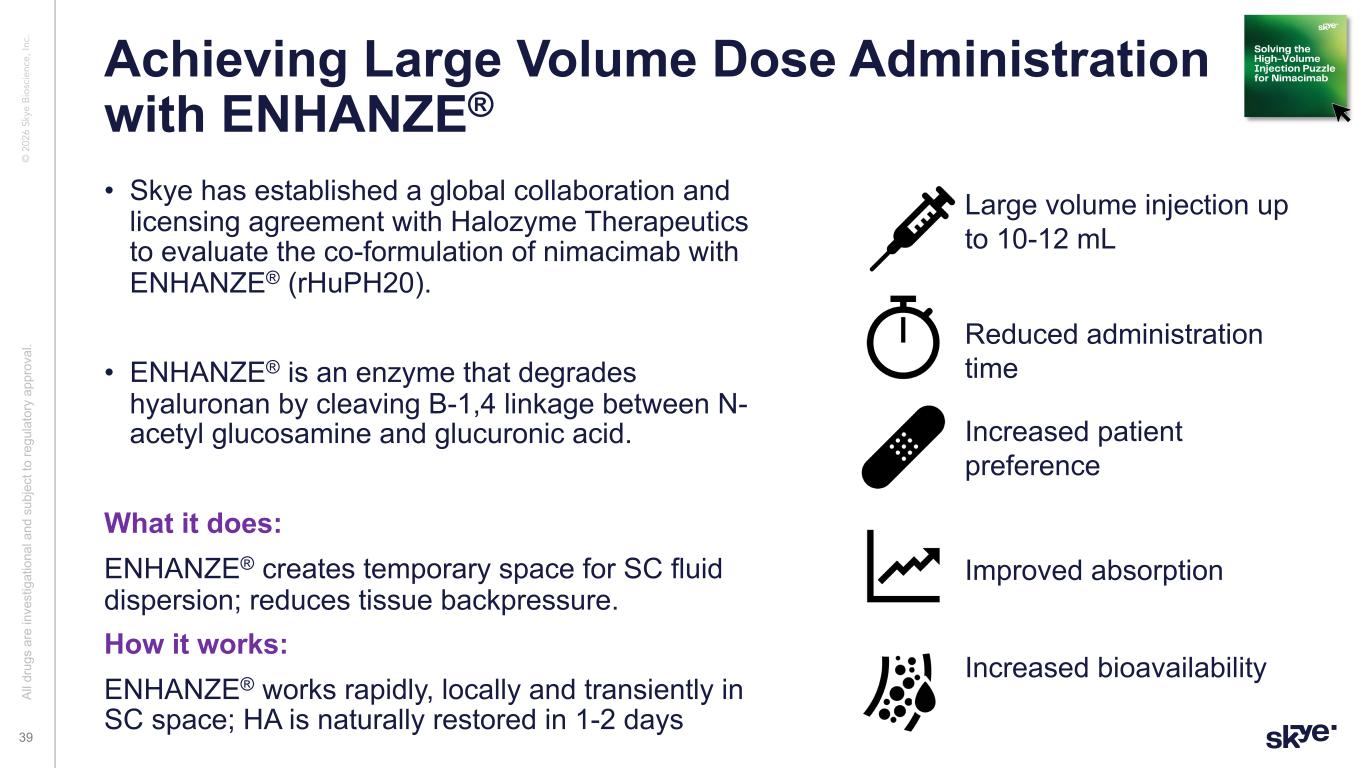 Al l d ru gs a re in ve st ig at io na l a nd s ub je ct to re gu la to ry a pp ro va l. © 2 02 6 Sk ye B io sc ie nc e, In c. Achieving Large Volume Dose Administration with ENHANZE® • Skye has established a global collaboration and licensing agreement with Halozyme Therapeutics to evaluate the co-formulation of nimacimab with ENHANZE® (rHuPH20). • ENHANZE® is an enzyme that degrades hyaluronan by cleaving B-1,4 linkage between N- acetyl glucosamine and glucuronic acid. What it does: ENHANZE® creates temporary space for SC fluid dispersion; reduces tissue backpressure. How it works: ENHANZE® works rapidly, locally and transiently in SC space; HA is naturally restored in 1-2 days 39 Al l d ru gs a re in ve st ig at io na l a nd s ub je ct to re gu la to ry a pp ro va l. Reduced administration time Large volume injection up to 10-12 mL Increased patient preference Improved absorption Increased bioavailability