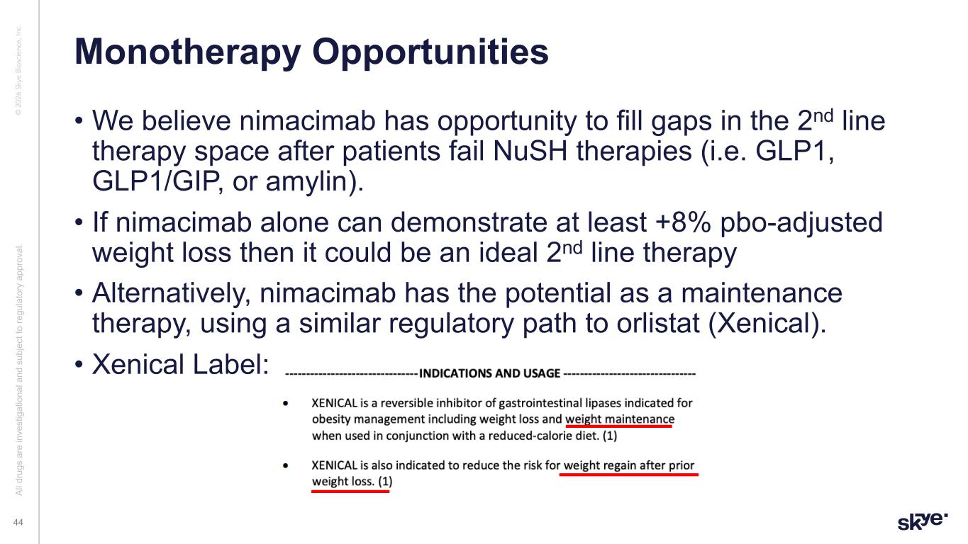 © 2 02 6 Sk ye B io sc ie nc e, In c. • Phase 2b adaptive design is meant to satisfy the FDA’s requirement to evaluate contribution of parts between nimacimab and semaglutide. • If acceptable, we believe the pivotal Phase 3 design may only require a two-arm study comparing combination of nimacimab + semaglutide versus placebo. • There is precedent for a similar approach as QSYMIA was approved by the FDA on the basis of studies evaluating the combination of phentermine + topiramate versus placebo. Combination Regulatory Strategy Al l d ru gs a re in ve st ig at io na l a nd s ub je ct to re gu la to ry a pp ro va l. 43