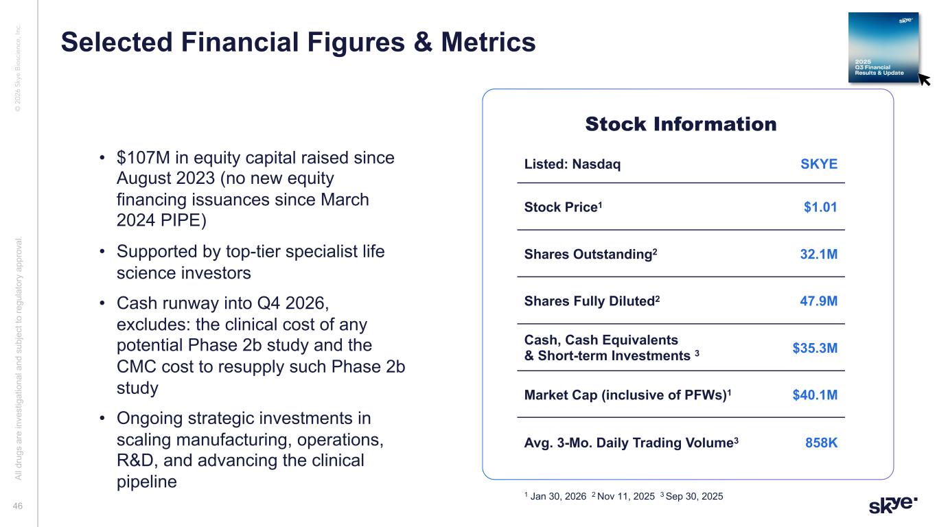 © 2 02 6 Sk ye B io sc ie nc e, In c. • $107M in equity capital raised since August 2023 (no new equity financing issuances since March 2024 PIPE) • Supported by top-tier specialist life science investors • Cash runway into Q4 2026, excludes: the clinical cost of any potential Phase 2b study and the CMC cost to resupply such Phase 2b study • Ongoing strategic investments in scaling manufacturing, operations, R&D, and advancing the clinical pipeline Stock Information Listed: Nasdaq SKYE Stock Price1 $1.01 Shares Outstanding2 32.1M Shares Fully Diluted2 47.9M Cash, Cash Equivalents & Short-term Investments 3 $35.3M Market Cap (inclusive of PFWs)1 $40.1M Avg. 3-Mo. Daily Trading Volume3 858K 1 Jan 30, 2026 2 Nov 11, 2025 3 Sep 30, 2025 Al l d ru gs a re in ve st ig at io na l a nd s ub je ct to re gu la to ry a pp ro va l. 46 Selected Financial Figures & Metrics