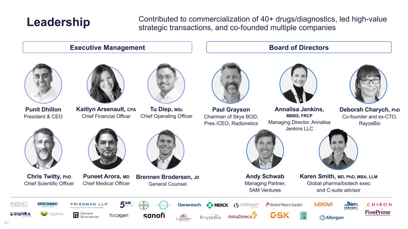 Deborah Charych, PhD Co-founder and ex-CTO, RayzeBio Contributed to commercialization of 40+ drugs/diagnostics, led high-value strategic transactions, and co-founded multiple companiesLeadership 47 Executive Management Board of Directors Tu Diep, MSc Chief Operating Officer Chris Twitty, PhD Chief Scientific Officer Kaitlyn Arsenault, CPA Chief Financial Officer Punit Dhillon President & CEO Andy Schwab Managing Partner, 5AM Ventures Paul Grayson Chairman of Skye BOD; Pres./CEO, Radionetics Annalisa Jenkins, MBBS, FRCP Managing Director, Annalisa Jenkins LLC Puneet Arora, MD Chief Medical Officer Karen Smith, MD, PhD, MBA, LLM Global pharma/biotech exec and C-suite advisor Brennen Brodersen, JD General Counsel
