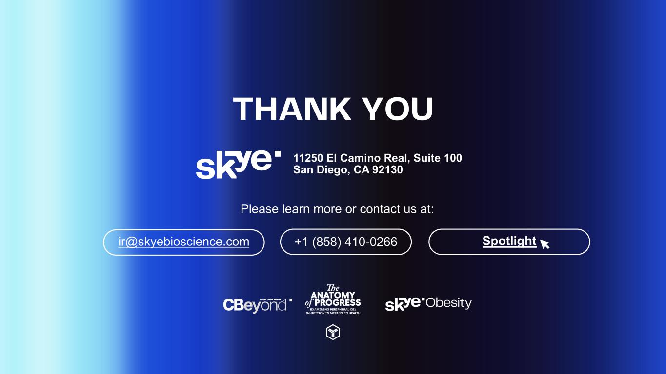THANK YOU 11250 El Camino Real, Suite 100 San Diego, CA 92130 ir@skyebioscience.com Please learn more or contact us at: +1 (858) 410-0266 Spotlight